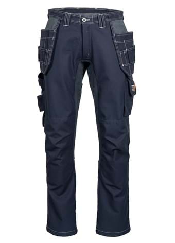 Reinforced fly and stretch in crotch. Nail pockets with tool pockets and HTFR Dobby reinforcement. Side pockets. Cargo pocket with flap, mobile phone pocket, pen pockets and concealed keyring holder. Ruler pocket with reinforced bottom, knife loop and concealed knife button. Shaped knees with inside kneepad pockets with two different placement levels. Stretch in back yoke and on the outside of the thigh. Hip pockets with pocket flap.