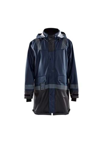Advanced rain jackets that holds up when work can?t stand still. An advanced rain jacket designed for people who work in a tougher climate that makes high demands on function and perfor-mance. This model is slightly longer and gives you effective protection while still having a flexible fit. The jacket is wind and waterproof with welded seams and ventilation in the back, a fleece-lined collar, easy-access front pockets with flap and press studs. It has an ID card pocket and Napoleon pocket inside the front flap. The sleeves have Velcro-fastening and neoprene cuffs that prevent water from seeping in. It has a buttonable drip hem at the bottom and has dark, discrete reflectors to make you visible in the dark. Certified to EN 343, Class 3.1, protection against bad weather.