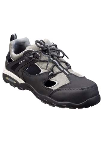 2428-3907-9990To us, it is obvious that a pair of safety shoes must be comfortable on your feet all day long and that they must function in the right environment. These very light protective sandals have composite toecaps and synthetic nail protection. Uppers in hardwearing nubuck and mesh. Nitrile outer sole to give you a good grip on slippery surfaces. The sole is shock absorbing, antistatic and water and oil repellent. Protection Class S1P SRC.