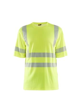 A high vis t-shirt with segmented reflective tape for extra visibility. The material of the t-shirt has a great absorption capacity, which means that the sweat is transported out from the inside of the shirt and makes it settle on the outside. Once there, the material makes the moisture dry quickly and creates a comfortable climate for the body. It cannot be industrially washed. Wash at 60 degrees. It is certified according to EN ISO 20471, XS-M class 2, L-> class 3.