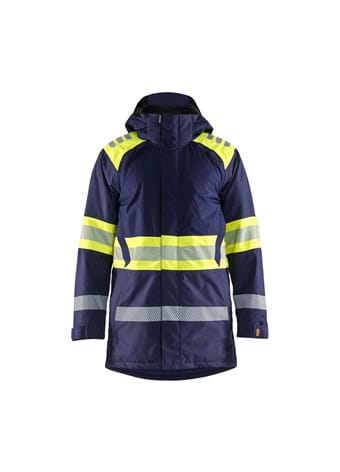 4485-1977-8933A Class 1 hi-vis winter parka with a design and quilted lining that keep you warm and assist you when you're on the job. The parka is wind and waterproof with taped seams, and the hood is detachable and adapted for helmets and ear defenders. Adjustable at the waist for individual comfort, zippers on the sides to facilitate and not restrict movement when working on knees or squatting.
