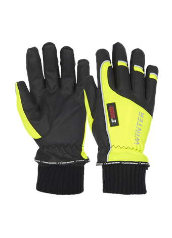 34704Helforet handske med PU-håndflade og elastisk mikrofiber overhånd i synlig neonfarve med refleksbånd og PU-forstærkninger. Handsken har strikket snefang og vandtæt membran.