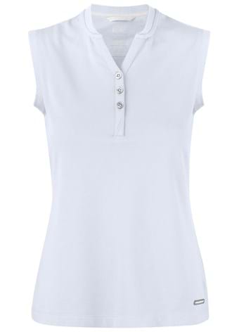 Fremstillet i vores berømte CB DryTec +35 UPF tri-blandingsmateriale, der er blødt og stretchy med god fugttransport. Denne ærmeløse damepolo har en formet halslinie og en længere stolpelukning for et feminint look. Kort stand-up krave og sporty pasform. Broderet CB logo på bagsiden.