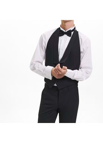 Den rette beklædning er prikken over i’et til enhver fest. Smokingvesten uden ryg giver et klassisk touch til dit outfit og fuldender dit aftenlook til festen. Vesten er designet til at være krølfri i ethvert miljø, så du altid ser skarp ud, om du sidder i bilen, i flyet eller ved middagsbordet. Vesten har passende detaljer såsom to skrålommer, fem stofbetrukne knapper og en justerbar bagside, som fuldender looket.