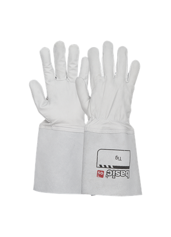 Svejsehandske af natur gedeskind med indsyet elastik i overhånden. Handsken har en lang stivet spalt krave.