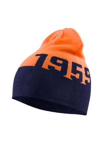 Børne beanie 2056, der kun er tilgængelig i highvis farver for øget synlighed. Den er vendbar, hvis du foretrækker et mere diskret udseende. Den originale side har teksten 'BLK 1959' i stort format, og på indersiden er den samme tekst i et meget mindre format.