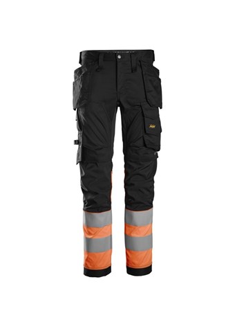 6234-0455Behagelige arbejdsbukser med høj synlighed i klasse 1 samt hylsterlommer og slim fit pasform til håndværkere, der arbejder inden for bygge og anlæg, vejarbejde eller transport.