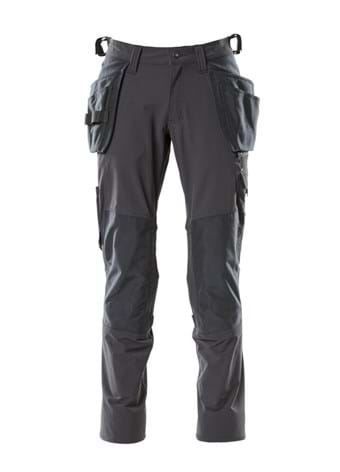 Strækstoffet er elastisk i alle retninger, hvilket giver en unik bevægelsesfrihed, hvor intet strammer eller generer.; Det multifunktionelle strækstof kombinerer en lav vægt med en meget høj slidstyrke, samtidig med det er vandafvisende.; Hængelommer i slidstærk CORDURA®.; Knælommer i slidstærk CORDURA® er regulerbare, så knæpuderne får den optimale placering.; Effektiv ventilation ved knæområdet via lynlås på siden af benet.; Ekstra synlig for omgivelserne ved hjælp af reflekseffekter.; Samcertificeret til brug med MASCOT knæpudetype SHORT eller LONG, da knæpudelommen kan højdejusteres.