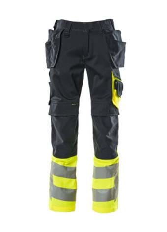 Slidstærke trenålssømme på ben og i skridt forlænger produktets levetid.; Overfladebehandlingen gør produktet smudsafvisende og sikrer dermed høj synlighed.; Hængelommer i slidstærk CORDURA® med ekstra lommer til værktøj.; Knælommer af slidstærk CORDURA® - med indstik af knæpude fra oven og med overfald, så de ikke samler snavs.; Kan nemt forlænges med 3 cm ved at sprætte den røde stikning på bagsiden op.; Det mørke stof er placeret, hvor produktet er mest udsat for snavs.; Produktet kan industrivaskes.; Samcertificeret til brug med MASCOT knæpudetype SHORT eller LONG, da knæpudelommen kan højdejusteres.