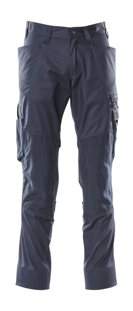 Særligt velegnet i varme omgivelser som følge af lav vægt og et højt indhold af bomuld.; Den lave talje med formskåret linning sikrer, at bukserne følger og støtter alle kroppens bevægelser.; Ergonomisk formede bukseben er konstrueret efter kroppens naturlige bevægelser.; Knælommer i slidstærk CORDURA® er regulerbare, så knæpuderne får den optimale placering.; Som standard i tre forskellige benlængder, så du kan vælge den bedste pasform og optimale placering af detaljer netop til dig.; Ekstra synlig for omgivelserne ved hjælp af reflekseffekter.; Produktet kan industrivaskes.; Samcertificeret til brug med MASCOT knæpudetype SHORT eller LONG, da knæpudelommen kan højdejusteres.