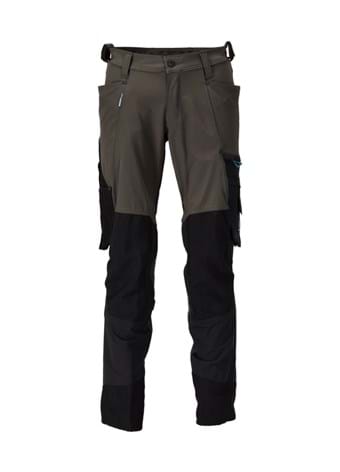 Strækstoffet er elastisk i alle retninger, hvilket giver en unik bevægelsesfrihed, hvor intet strammer eller generer.; Det multifunktionelle strækstof kombinerer en lav vægt med en meget høj slidstyrke, samtidig med det er vandafvisende.; Knælommer i slidstærk CORDURA®.; Effektiv ventilation ved knæområdet via lynlås på siden af benet.; Som standard i tre forskellige benlængder, så du kan vælge den bedste pasform og optimale placering af detaljer netop til dig.; For at opnå størst mulig komfort anbefaler vi, at du vælger knæpuder 00718-100 til denne model.; Samcertificeret til brug med MASCOT knæpudetype, LONG.