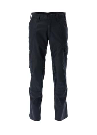 Tonålssømme og trenålssømme på ben. Lav talje. Bæltestropper. Knaplukning er skjult. Gylp med lynlås. Bukseben er ergonomisk formede. Forlommer. Baglommer. Lårlomme med telefonlomme og klap med skjulte trykknapper. Tommestoklomme er forstærket. Knælommer i polyester. Nem, individuel regulering af knælommens højde. Reflekser på ben. Vi anbefaler 00418-100, 00718-100, 50451-916 og 20118-915 knæpuder til denne model. Samcertificeret med knæpudetype SHORT eller LONG i henhold til EN 14404.