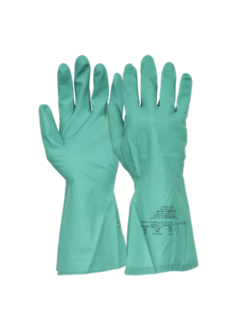 Nitrilhandske med mønstret håndflade og bomuldsvelourisering. Længde: 33 cm. Tykkelse: 0,36 - 0,38 mm.