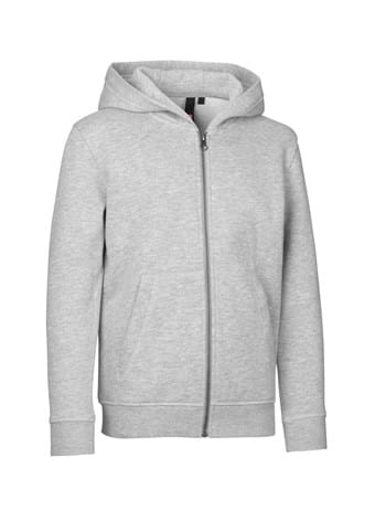 Børne hætte sweat cardigan med kængurulomme i ny opdateret pasform. Gennemgående YKK lynlås i front. Rib afslutning ærmer og forneden. Blød, børstet inderside.