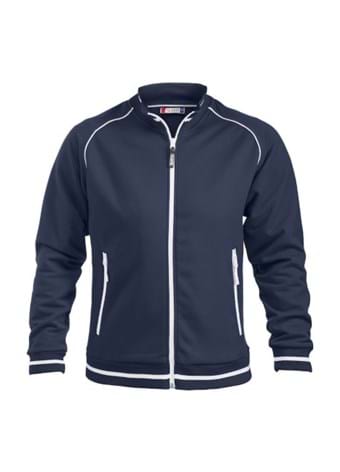 Unisex jakke i struktur strik med kæmmet inderside. Jakken har kontrast striber på kraven, nederst og på ærmerne. To forlommer med kontrast lynlås.