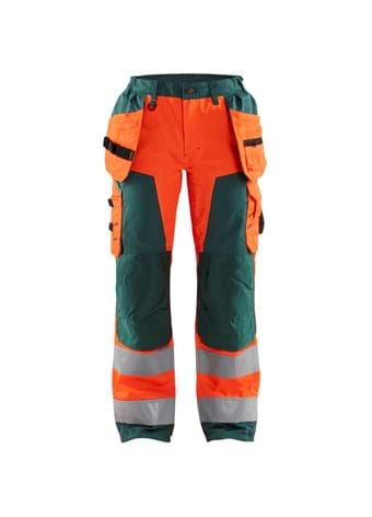High Vis Dame buks med sømlommer, der er slidstærke, vandafvisende og smarte. Høj komfort, stor funktionalitet og Cordura® forstærkninger på knæene. Bukserne har elastik i taljen for en behagelig pasform og justerbare bukseben med løbegang i bunden. Certificeret i henhold til EN ISO 20471 Klasse 2. Findes også uden sømlommer, model 7155