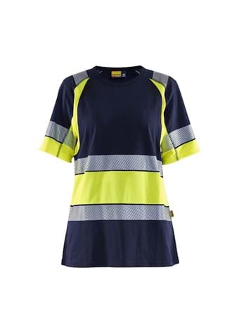En moderne, blød og komfortabel T-shirt til kvinder. High vis områderne her en fugttransporterende og anti-lugt funktion. Rund hals med forstærkede skulderssømme. Fleksible reflekser for god ventilation og optimal bevægelsesfrihed. T-shirtens mørke områder er 100 % bomuld, og high vis områderne er 100 % polyester. Certificeret i henhold til EN ISO 20471 Klasse 1. Samcertificeringsgruppe D. Findes også i herremodel 3421.