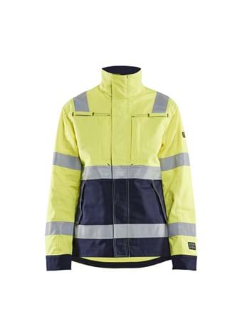 Multinorm jakke i damemodel, lavet af slidstærkt materiale og designet til at være synlig fra alle sider. Jakken er kortere foran for maksimal bevægelsesfrihed, og en forlænget ryg for ekstra beskyttelse. Jakken har brystlommer i begge sider og smarte detaljer som en inderlomme med indvendig telefonlomme og mørkt materiale på de områder der er udsat for snavs. Godkendt til industrivask. Beskytter mod stænk fra flydende kemikalier. Certificeret til EN 1149-5, EN 13034, EN ISO 11611, EN ISO 11612, IEC 61482-2, ATPV: 11,0 cal/cm², EN ISO 20471 klasse 2 XS-S, klasse 3 M -->
