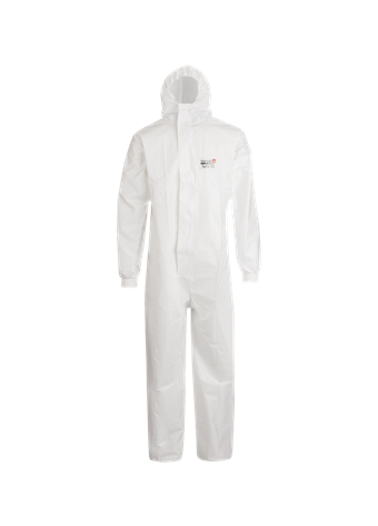 Heldragt i kategori III godkendt som type, 5B (partikeltæt) og 6B (begrænset stænktæt) samt beskyttelse mod biologisk forurenede partikler (B). Antistatisk EN 1073-2:Klasse 2. Dragten er med lynlås og hætte samt elastik ved hætte og ankler. Strikket ribkant ved håndled. Flap ved lynlås og tapede sømme for tæthed.