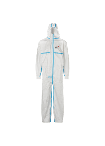 Hvid heldragt med hætte 100 % uvævet polyethylen Lynlås med selvklæbende flap Strikket rib ved håndled, elastik ved ankler og hætte Svejsede sømme Antistatisk behandlet Kategori III Virus- og bakterietæt Type 4B/5B/6B.