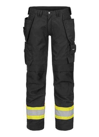 Tool holder belt loops in waist. Reinforced fly and stretch zones in crotch. Side pockets. HTPA Dobby lined nail pockets with loop strip for hanging multiple tools. Left cargo pocket with flap, concealed keyring holder and strap for ID-pocket, mobile phone pocket with stretch zone. Right cargo pocket with multiple tool pockets and ruler pocket. Kneepad pockets in HTPA Dobby with two different placement levels. 4-way stretch around knee, in seat and on back of legs. Back pockets. Back hem in HTPA Dobby with reflective detail. Adjustable foot width with plastic press studs.