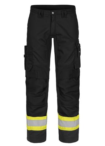 Reinforced fly and stretch zones in crotch. Side pockets. Left cargo pocket with flap, concealed keyring holder and strap for ID-pocket, mobile phone pocket with stretch zone. Right cargo pocket with multiple tool pockets and ruler pocket. Kneepad pockets in HTPA Dobby. 4-way stretch around knee, in seat and on back of legs. Back pockets. Reinforced back hem in HTPA Dobby with reflective detail. Adjustable foot width with plastic press studs.