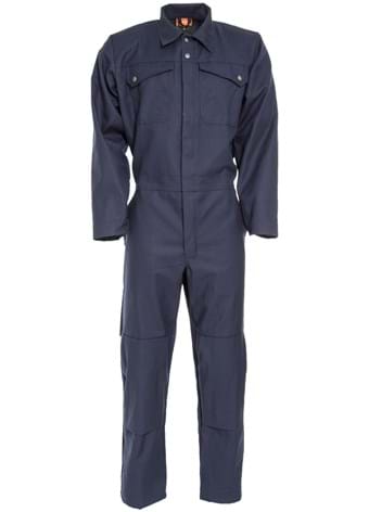 Boilersuit with kneepad pockets in 100% cotton for industrial use. Concealed buttons and metal front zip. Chest pockets with flaps. D-ring. Side pocket with hidden access. Back pockets. Adjustable kneepad pockets with two levels. Adjustable waistband. Ruler pocket. Action back for free movement.