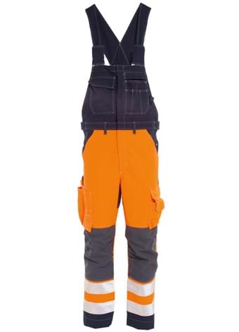 Non-Metal and Inherent Flame Retardant Hi-Vis bib ’n’ brace with front zip in a comfortable and tear resistant fabric with good colourfastness. Adjustable braces with hidden fixed lock closing and elastic in back. Chest pockets, one with flap. Concealed knife buttons. Inside pocket. Adjustable waist. Side pockets. Right cargo pocket with tool pocket and concealed knife button with strap and ruler pocket. Left cargo pocket with flap, concealed keyring holder and mobile phone pocket. Hip pockets with flap. HTFR Dobby reinforced and shaped knees with adjustable inside kneepad pockets. Back hem in HTFR Dobby. Buttons for accessory 9062 84 50, radio pocket. Long and short sizes - will be amended after order. Approximately 5 days extra delivery time.