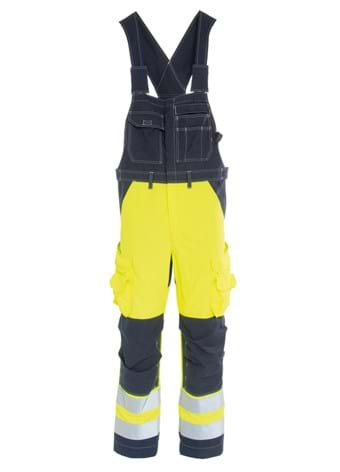Non-metal and Inherent Flame Retardant Hi-Vis bib 'n' brace with front zip in a light fabric with a comfortable feel and good tear resistance. Adjustable braces with hidden fixed lock closing and elastic in back. Front zip. Chest pockets, one with flap. Concealed knife buttons. Inside pocket. Adjustable waist. Side pockets. Right cargo pocket with flap, ruler pocket, separate mobile phone pocket, pencil holder and concealed knife button with loop. Left cargo pocket with flap and concealed keyring holder, ruler pocket, first aid pocket and concealed knife button with loop. Shaped knees with adjustable inside kneepad pockets. Hip pockets with flap. Long and short sizes - will be amended after order. Approximately 5 days extra delivery time. Contrast stitching.