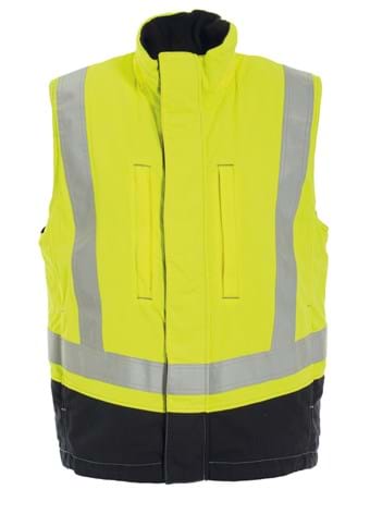 Non-metal and Inherent Flame Retardant Hi-Vis bodywarmer with vertical chest pockets and fiberfur lining. Hidden zip and stud fastener in front. Vertical chest pockets with zip. Vertical side pockets with fleece lining. Two inside pockets, one for documents/Ipad. Draw cord at the bottom of the jacket. Zip access for back heat seal badges. Buttons for attaching hood 9065 81. Fleece on the inside of the collar. Special order – please allow an additional 5 days approximately. *To meet the requirements of the standard, the waistcoat must be worn with a long sleeved garment with the same certification.
