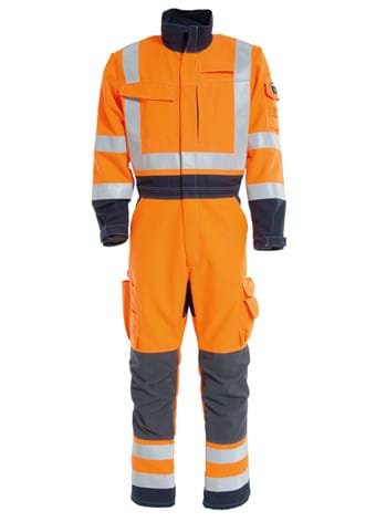Non-Metal and Inherent Flame Retardant Hi-Vis boilersuit in a comfortable and tear resistant fabric with good colourfastness. Concealed button and zip closing. Vertical chest pocket with zip on left side. Chest pocket with flap on right side. Sleeve pocket with flap and concealed keyring holder and strap for ID-pocket. Adjustable elasticated waistband and actionback for free movement. Adjustable cuffs. Side pockets with hidden access. HTFR Dobby reinforced and shaped knees with adjustable inside kneepad pockets. Right cargo pocket with tool pockets, concealed knife button with loop and ruler pocket. Left cargo pocket with flap, concealed keyring holder and mobile phone pocket. Hip pockets with flap. Back hem in HTFR Dobby. Buttons for accessory 9062 84 50, radio pocket.