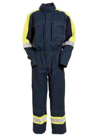 Inherent Flame Retardant boilersuit with increased visibility, in a material with good protection against several molten metals and highest possible protection against molten iron. Concealed button and zip closings. Two loops for communication equipment. Chest pockets with concealed zip. Front pockets with flap. Kneepad pockets with two levels. Hip pockets with flap. Ruler pocket. Elasticated waistband and actionback for free movement. Reflective stripes around legs, sleeves and over shoulder. Contrast stitching.