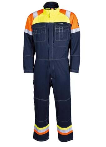 PFAS-free and Inherent Flame Retardant boilersuit with increased visibility. Sleeves and front in Cantex Weld and back in Cantex Stretch. Concealed front zip closing. Two loops for communication equipment. Right chest pocket with flap, with tool strap and concealed keyring holder for ID-pocket. Left chest pocket with opening for pencils, pencil pockets and tool strap. Large zip pocket under left chest pocket. Side pockets with flap. Kneepad pockets with two different placement levels. Hip pockets with flap. Hammer loop. Ruler pocket with flap and reinforced bottom. Adjustable cuffs with press studs. Elasticated waistband and actionback for free movement. Reinforced back hem in Barricader EP and adjustable foot width with press studs. Contrast stitching.