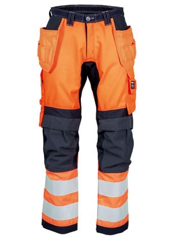Non-metal and Inherent Flame Retardant trousers with nail pockets and stretch for excellent fit and increased comfort ensuring full mobility at work. Reinforced fly and stretch zones in crotch. Nail pockets with tool pockets and HTFR Dobby reinforcement. Side pockets. Cargo pocket with stretch zone and flap with concealed keyring holder, mobile phone pocket with flap. Ruler pocket with tool pockets and knife button with loop. Shaped knees with kneepad pockets in HTFR Dobby and stretch zones. Back yoke in stretch. Back pockets with pocket flaps. Back hem in HTFR Dobby. Adjustable foot width with press studs.
