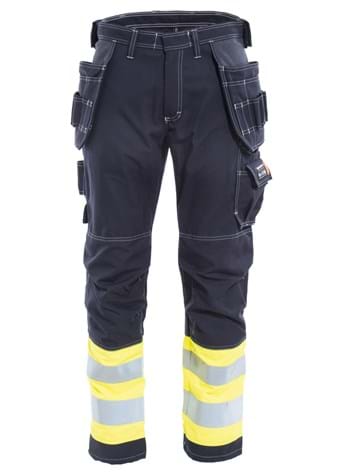 Non-metal and Inherent Flame Retardant Hi-Vis trousers with nail pockets in a light fabric with a comfortable feel and good tear resistance. Tool holder belt loops in waist. HTFR Dobby reinforced tool pockets with tool strips. Side pockets. Back pockets with pocket flaps. Cargo pocket with flap, concealed keyring holder and first aid pocket. Ruler pocket and concealed knife button with loop. Shaped knees with adjustable inside kneepad pockets. Special order – please allow an additional 5 days approximately. Contrast stitching.