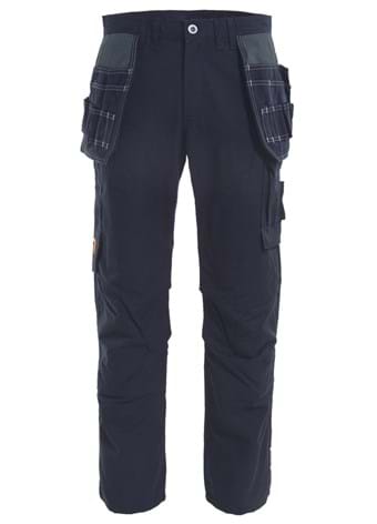 Non-metal and Inherent Flame Retardant trousers with nail pockets in a light fabric with a comfortable feel and good tear resistance. HTFR Dobby reinforced tool pockets with tool strips. Front pockets. Hip pockets with flaps. Cargo pocket with flap, mobile phone pocket, hidden keyring holder and tool strap. Ruler pocket. Shaped knees with adjustable inside kneepad pockets.