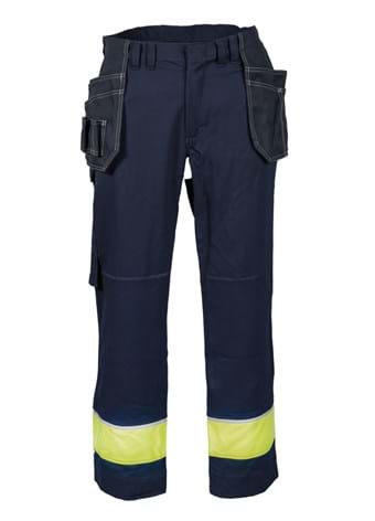 Inherent Flame Retardant trousers with nail pockets. The trousers are made in a comfortable fabric with the highest protection against molten aluminium. The fabric also has good properties against other molten metals. Double tool pockets with tool strips. Front pockets. Hip pocket with flap. Ruler pocket with flap. Inside kneepad pockets. Thin reflective stripes on legs.