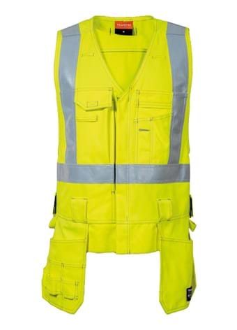 Inherent Flame Retardant Hi-Vis multi-function tool vest in a light fabric with a comfortable feel and good tear resistance. Concealed front zip closing. Right chest pocket with mobile phone and pencil pocket. Left chest pocket and pencil pocket. Four nail pockets. Large belt loops. Tool holder loops at waist for extra accessories. Keyring holder. *To meet the requirements of the standard, the waistcoat must be worn with a long sleeved garment with the same certification.