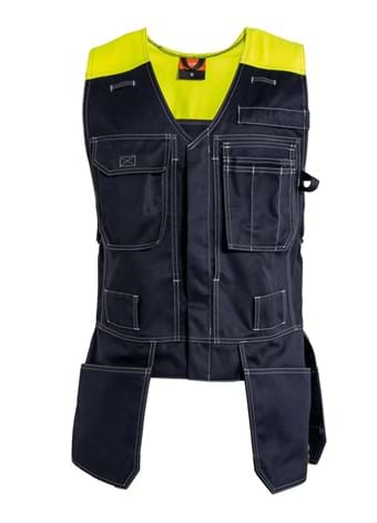 PFAS-free and Inherent Flame Retardant tool vest with increased visibility. Concealed front zip closing. Two holders for headset. Right chest pocket flap. Left chest pocket with pencil pockets. Large front pockets under chest pockets. Four nail pockets. Extra tool pockets inside the nail pockets on the back. Large belt loops. Contrast stitching. *To meet the requirements of the standard, the waistcoat must be worn with a long sleeved garment with the same certification.