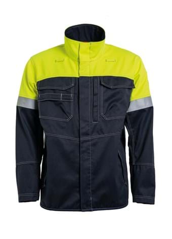 PFAS-free and Inherent Flame Retardant jacket with increased visibility on sleeves and front in Cantex Weld and back in Cantex Stretch. Cantex Stretch provides the jacket with flexibility and gives you freedom of movement with high levels of comfort, whil Concealed front zip and press studs. Extended back. Two loops for communication equipment. Chest pockets with flap, right pocket with tool strap and concealed keyring holder for ID-pocket. Vertical pocket with zip on left chest. Roomy side pockets with flap. Adjustable cuffs with press studs. Draw cord at waist. Inside pocket. Contrast stitching.
