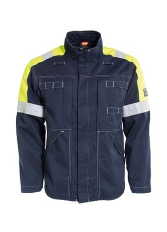 Inherent Flame Retardant jacket with increased visibility, in a material with good protection against several molten metals and highest possible protection against molten iron. Concealed front zip and button closing. Extended back. Two loops for communication equipment. Chest pockets with concealed zip. Roomy side pockets with flaps. Inside pocket. Draw cord at waist. Reflective stripes around sleeves, over shoulder and on back. Contrast stitching.