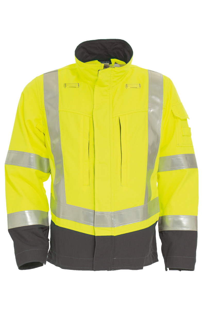 Non-metal and Inherent Flame Retardant Hi-Vis jacket with vertical chest pockets in a light fabric with a comfortable feel and good tear resistance. Concealed front zip and press studs. Two loops for communication equipment. Vertical chest pockets with zip. Side pockets. Sleeve pocket with flap and concealed keyring holder. Inside mobile phone pocket. Inside pockets/document pockets. Adjustable waist and cuff. Contrast stitching.