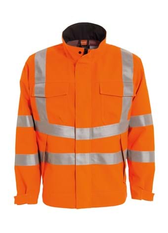 Non-metal, Flame Retardant Hi-Vis jacket in double weave fabric with comfort finish on the inside, developed for the railway industry. Extended back. Concealed front zip and press stud. Arm ventilation. Chest pockets with flaps. Loop for radio/gas monitor under right chest pocket flap. Side pockets with flaps. Two inside pockets with flaps. Inside mobile phone pocket. Draw cord at the bottom of the jacket. Adjustable cuffs.