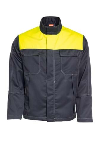 Flame Retardant jacket with double yoke to achieve extra protection against heat. The jacket is made of a strong and flexible satin customised for work with zinc and chemicals. Concealed front closing with press studs and jeans button. Chest pockets with flap. Side pockets with flap. Three inside pockets. Adjustable cuffs. Contrast stitching.