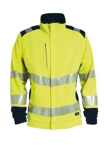 Non-metal and Inherent Flame Retardant Hi-Vis ladies cardigan in a soft sweatshirt fabric with 20% recycled cotton. Concealed zip closing. Chest pocket with zip. Front pockets. Ribbed cuffs. Heat sealed reflective stripes. *The jacket has a combined certification and is approved for EN ISO 20471 CL.3 when worn together with Tranemo trousers or bib 'n' brace certified according to EN ISO 20471 CL.1 or CL.2.