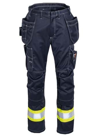 PFAS-free and Inherent Flame Retardant ladies trousers with increased visibility, nail pockets, front in Cantex Weld and back in Cantex Stretch. Cantex Stretch provides the trousers with flexibility and gives you freedom of movement with high levels of comfort. Double tool pockets with tool strips. Side pockets. Back pockets. Hammer loops. Left cargo pocket with flap, mobile phone pocket, pencil pocket and concealed keyring holder. Right cargo pocket with an extra tool pocket, ruler pocket with concealed knife button with loop. Kneepad pockets with two different placement levels. Adjustable foot width with press studs. Reinforced back hem. Contrast stitching.