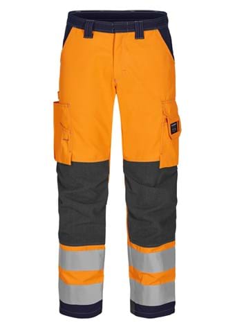 Side pockets. Hip pockets with flaps. Left cargo pocket with flap, mobile phone pocket and hidden keyring holder for attaching ID-pocket. Right cargo pocket with tool pockets, pen pocket and ruler pocket. HTFR Dobby reinforced and shaped knees with adjustable inside kneepad pockets. Back hem in HTFR Dobby. Contrast stitching. These trousers have a sewn in lining, size will fit smaller. *The garment is tested in a 3 layer system together with basic underwear. Tranemo recommends underwear 5930 and 5990. **Only applies to sizes certified to EN ISO 20471 class 2.