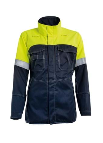 PFAS-free and Inherent Flame Retardant ladies jacket with increased visibility, sleeves and front in Cantex Weld and back in Cantex Stretch. Cantex Stretch provides the jacket with flexibility and gives you freedom of movement with high levels of comfort, Concealed front zip and press studs. Extended back and two side slits for enhanced movement. Two loops for communication equipment. Chest pockets with flap, right pocket with tool strap and concealed keyring holder for ID-pocket. Vertical pocket with zip on left chest. Roomy side pockets with flap. Adjustable cuffs with press studs. Inside pocket. Contrast stitching.