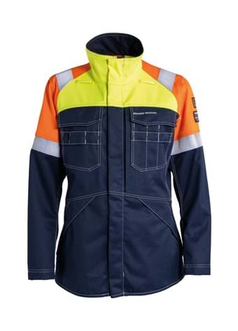 PFAS-free and Inherent Flame Retardant ladies jacket in Cantex Weld/Cantex Weld Stretch with increased visibility. Yellow back in Cantex Stretch. Concealed front zip and press studs. Extended back and two side slits for enhanced movement. Two loops for communication equipment. Right chest pocket with flap, with tool strap and concealed keyring holder for ID-pocket. Left chest pocket with opening for pencils, pencil pockets and tool strap. Large zip pocket under left chest pocket. Roomy side pockets with flap. Adjustable cuffs with press studs. Inside pocket. Contrast stitching.