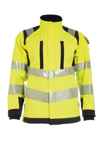 Non-Metal, wind and water resistant Inherent Flame Retardant Hi-Vis ladies softshell jacket with very high comfort. The jacket has a high Arc Rating and is ergonomically shaped for working with raised arms. Heat sealed reflective stripes for greater comfort. Concealed front zip and double storm flap with press studs. Two loops for communication equipment. Chest pockets with zip. Side pockets with zip. Left sleeve pocket with flap, hidden keyring holder and strap for ID-pocket. Inside knitted cuffs in sleeves. *The jacket has a combined certification and is approved for EN ISO 20471 CL.3 when worn together with Tranemo trousers or bib 'n' brace certified according to EN ISO 20471 CL.1 or CL.2.